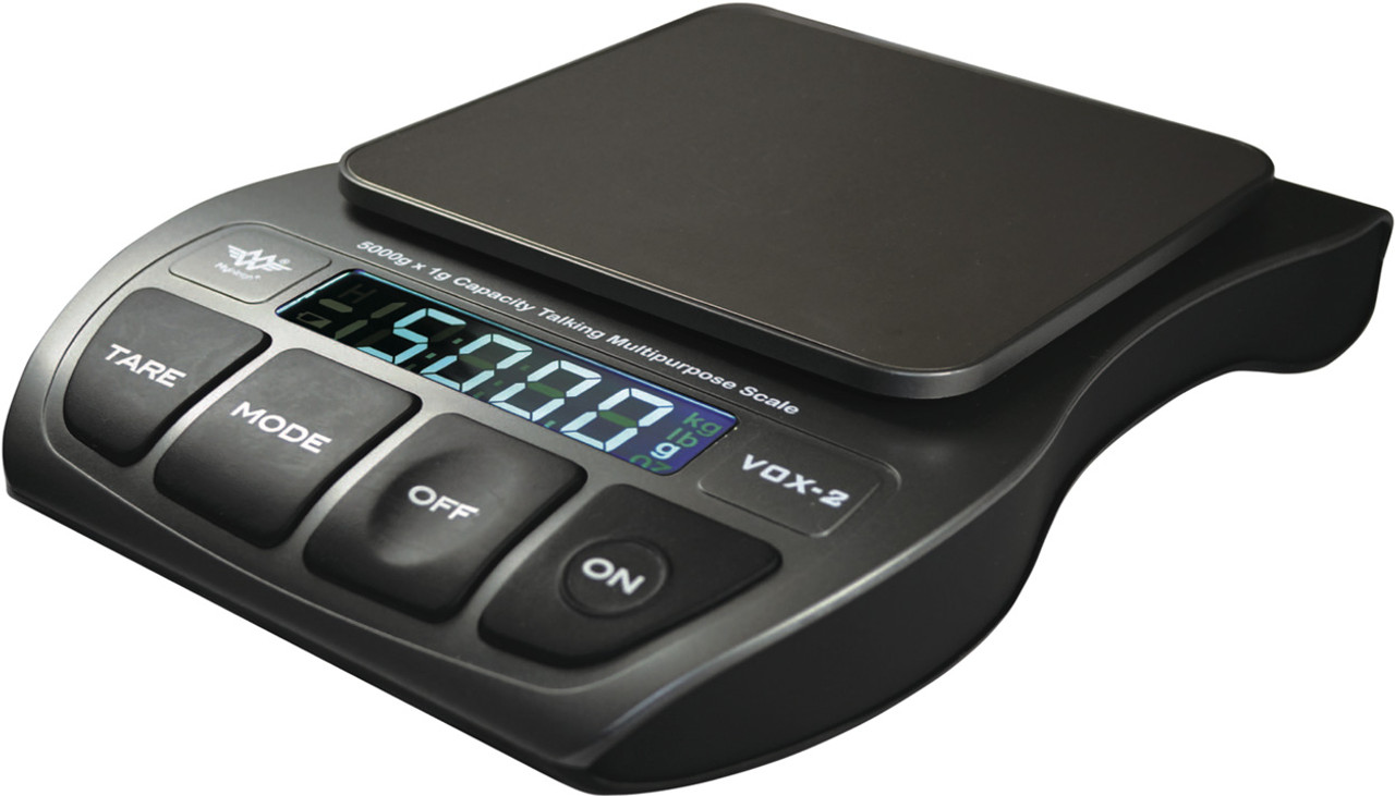 The Vox-2 talking kitchen scale is small, easy to use, accurate, and affordable, and it can be used by anyone who wants to weigh food in either grams or ounces. It has a 6 lb 10 oz or 3000 grams weight capacity. You turn it on, and after it speaks “Hello” and “I am ready”, you can place the food on the stainless steel platform or in the plastic bowl. A pleasant female voice announces the grams or ounces. There is a tare function if you want the weight of the food excluding the bowl.