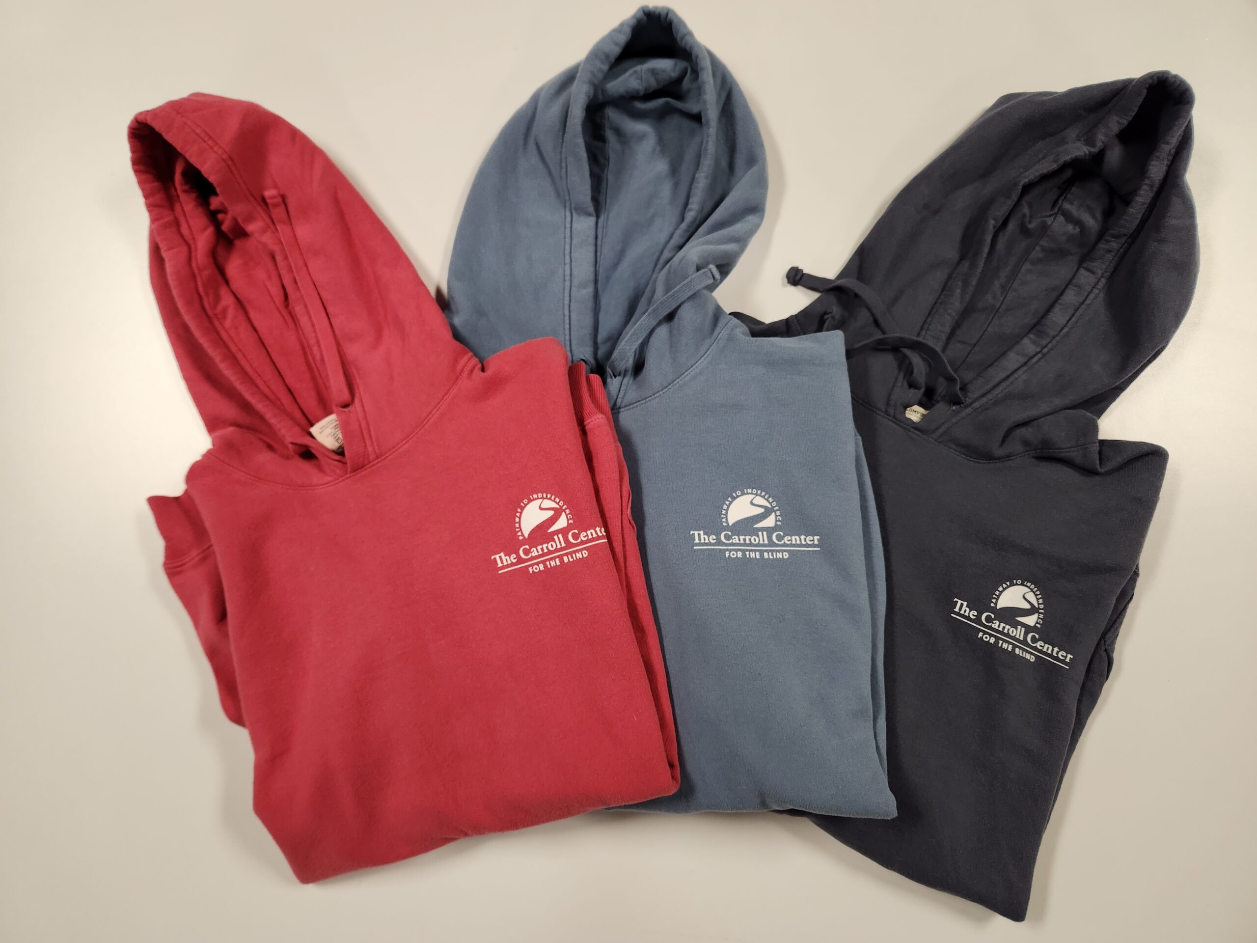 Stay warm and comfy in style, while promoting the Carroll Center for the Blind. We are excited to launch a new hooded sweatshirt in three colors: red, light blue, and black. The hoodies feature the Carroll Center logo on the front of the sweatshirt as well as the following Father Thomas Carroll quote on the back: